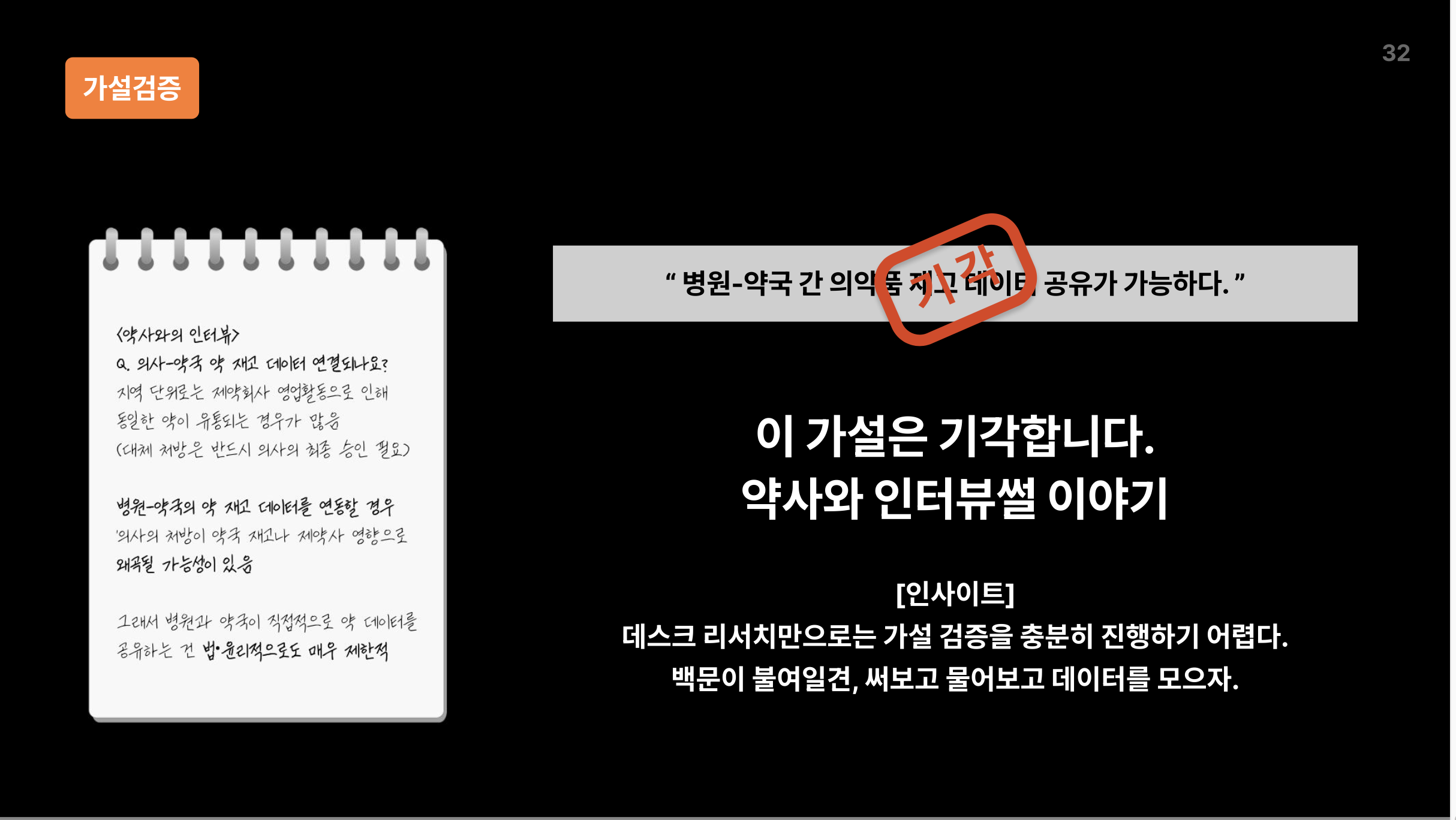 그러나 데스크 리서치만으로는 이 가설의 사실 여부를 명확히 판단할 수 없었고, 이에 따라 직접 약국을 방문하여 약사와 인터뷰를 진행했습니다. 결과적으로, 약사로부터 실제로는 재고 데이터가 공유되지 않는다는 답변을 받았고, 이로 인해 해당 가설은 기각되었습니다.